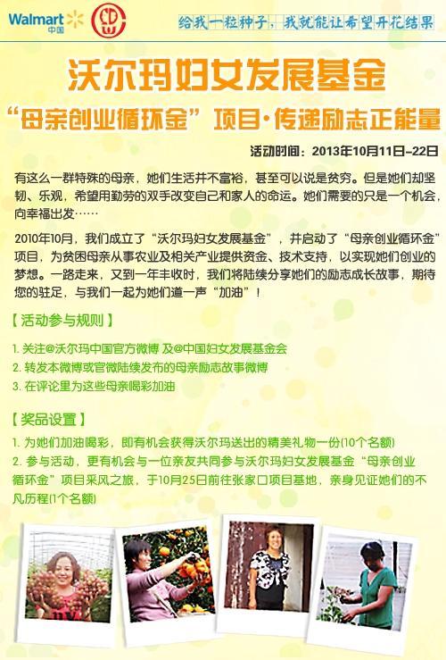 深圳2013年10月14日電 /美通社/ -- 近日,沃爾瑪中國在官方微博(@沃爾瑪中國官方微博,http://weibo.com/wmcsr)上線“為創(chuàng)業(yè)母親喝彩,傳播勵志正能量”慈善主題活動,講述在沃爾瑪“母親創(chuàng)業(yè)循環(huán)金”項(xiàng)目幫助下,貧困母親的勵志創(chuàng)業(yè)故事;并號召網(wǎng)友參與互動,為這些通過辛勞改變自己和家人命運(yùn)的母親們喝彩。網(wǎng)友參與微博活動,即有機(jī)會贏取精美禮物,還有可能被選中參與沃爾瑪“母親創(chuàng)業(yè)循環(huán)金”項(xiàng)目采風(fēng)之旅,前往張家口項(xiàng)目基地,見證創(chuàng)業(yè)母親的成長歷程。