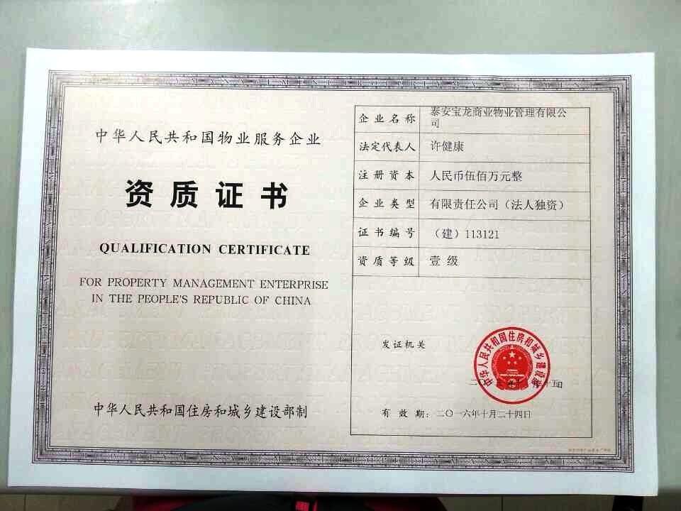 上海2013年11月1日電 /美通社/ -- 2013年10月31日,寶龍集團(tuán)旗下的泰安寶龍商業(yè)物業(yè)管理有限公司正式收到由國家住房和城鄉(xiāng)建設(shè)部頒發(fā)的國家一級物業(yè)服務(wù)企業(yè)資質(zhì)證書,成功晉升物業(yè)管理國家一級資質(zhì)物業(yè)服務(wù)企業(yè),標(biāo)志著寶龍物業(yè)服務(wù)已經(jīng)得到了行業(yè)主管部門和市場的廣泛認(rèn)可,為濟(jì)身于全國先進(jìn)物業(yè)管理企業(yè)行列、在市場運(yùn)作和項(xiàng)目發(fā)展方面奠定了堅(jiān)實(shí)的基礎(chǔ)。