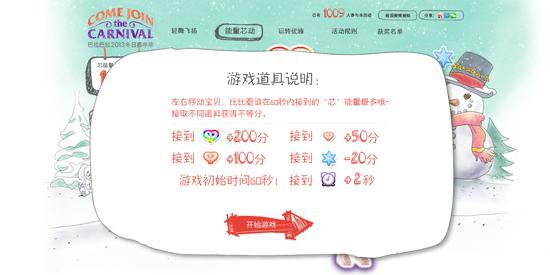 游戲?yàn)榉种圃u(píng)判,每接到彩虹羽絨“芯”,加分200分,大小不同的羽絨“芯”分別加100分和50分,如果你的反應(yīng)稍有遲緩碰到冷冰冰的小雪花,就會(huì)因打寒戰(zhàn)而減去20分,在有限的時(shí)間里接到越多羽絨“芯”分?jǐn)?shù)就會(huì)越高,而及時(shí)出現(xiàn)的小鬧鐘會(huì)延長5秒鐘游戲時(shí)間。每天分?jǐn)?shù)較高的前十位玩家,都將獲得精美獎(jiǎng)品一份,獲獎(jiǎng)結(jié)果將以第一次排名為準(zhǔn),每位玩家將只有一次獲獎(jiǎng)機(jī)會(huì),之后繼續(xù)參與游戲的玩家,分?jǐn)?shù)只參與排名,不再加入獲獎(jiǎng)名單。