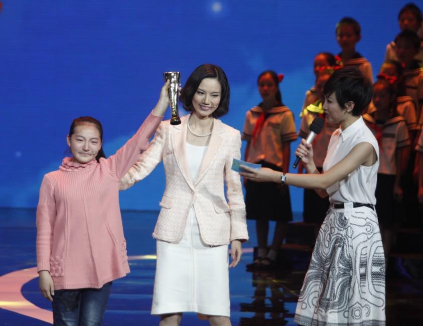 伽藍集團對外事務高級總監趙曼麗(中)代表自然堂品牌為最美孝心少年高雨欣頒獎