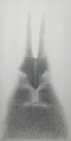 “兔”是藝術家邵北番常用的一個題材。這副他捐贈給美麗中國的“水墨兔肖像”受到中國古代肖像繪畫的啟發,延續了邵北番的肖像畫一貫的風格:即獨特又神秘莫測。一只兔子不單是一只兔子,一只鹿也不知是一只鹿。他的作品展現的是一種存在于每一生物上的精神,這種精神就是人與自然之間的聯系。